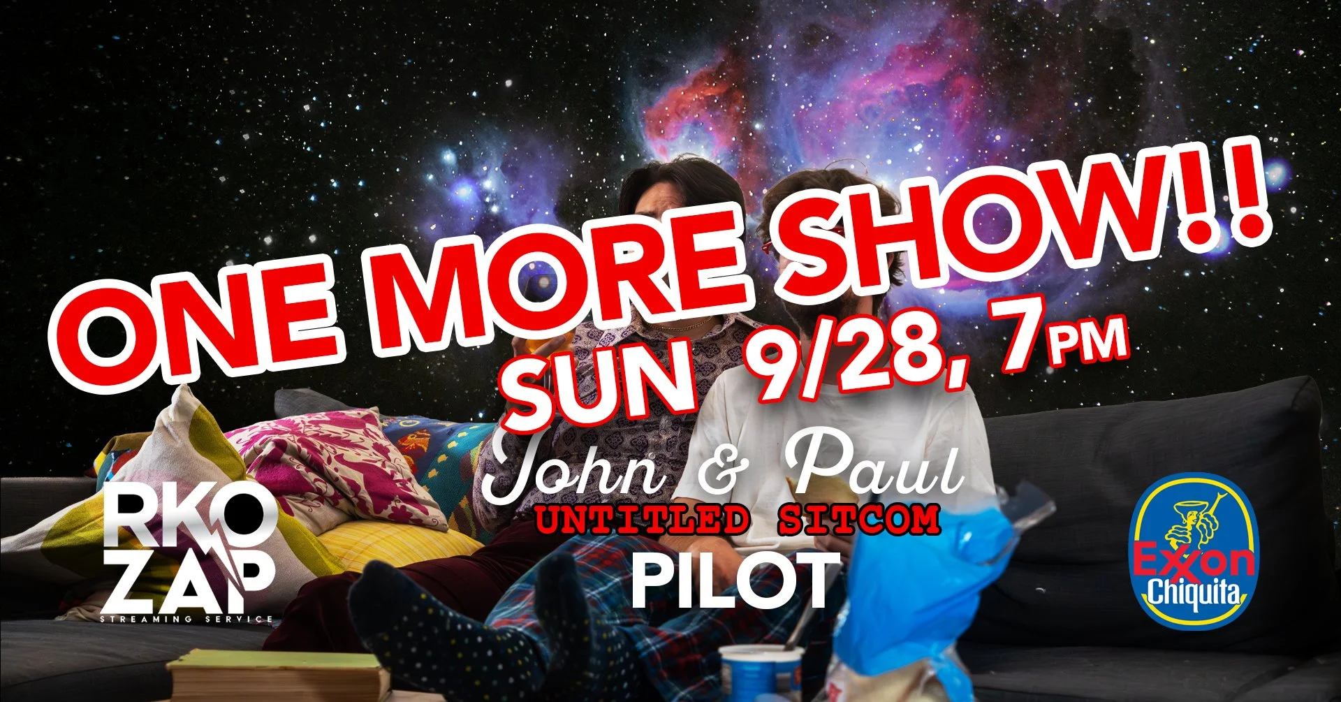 You are cordially invited to a public taping of John and Paul's next step in evolution, a sitcom pilot starring the endearing duo, under the auspices of RKO's new streaming service, streaming under the auspices of amiable overlords.